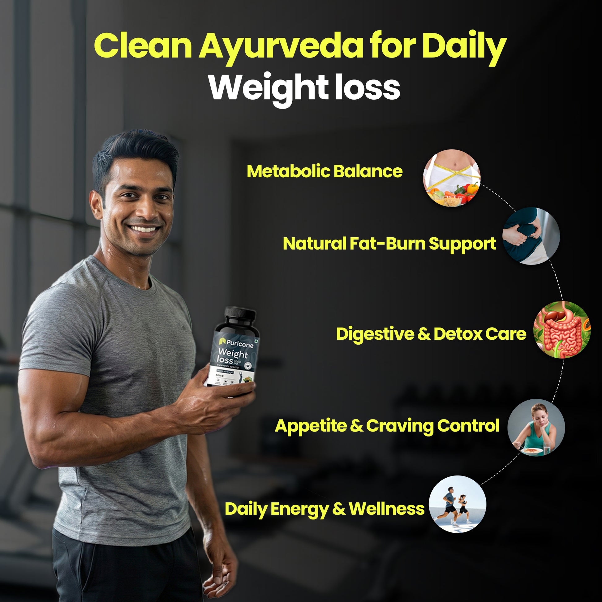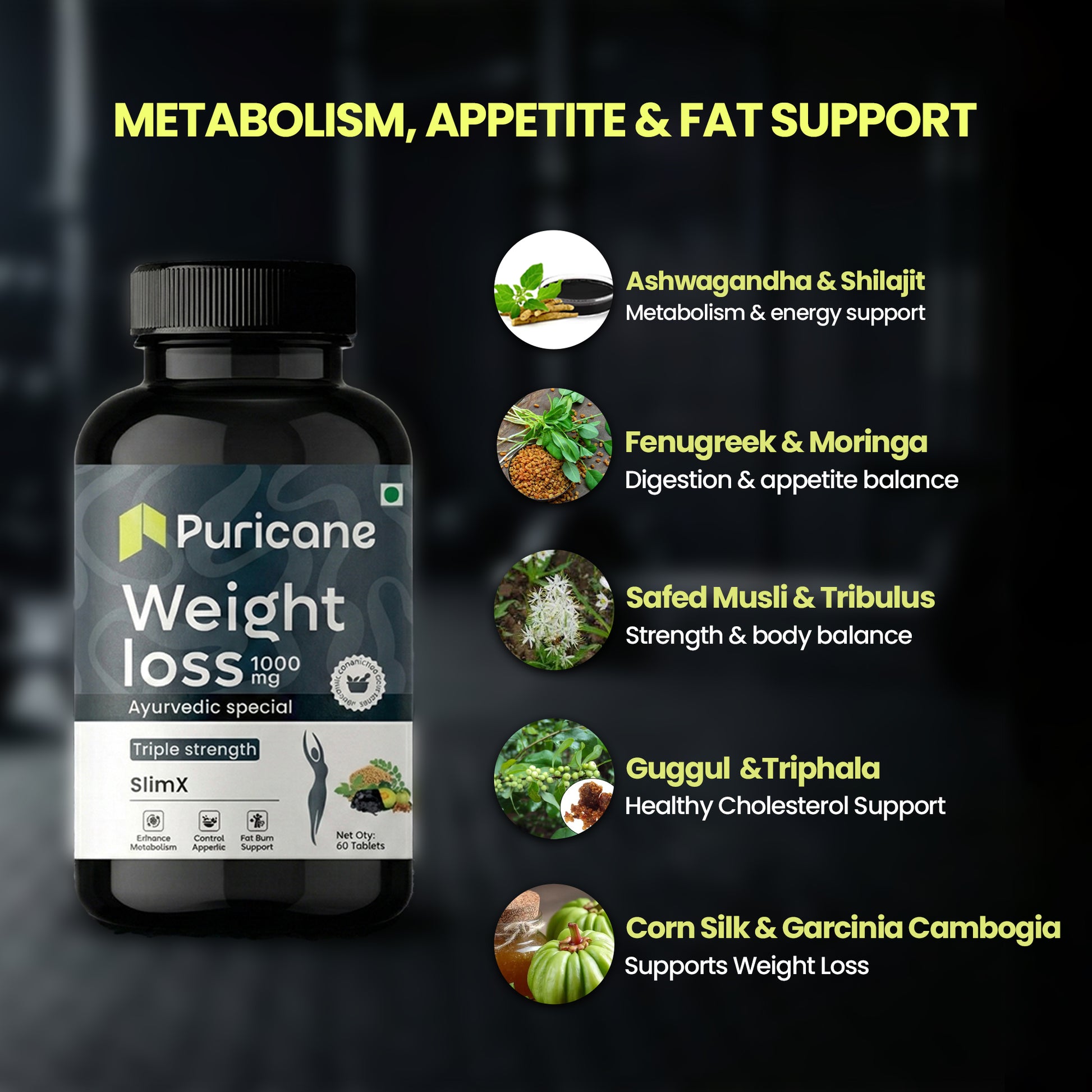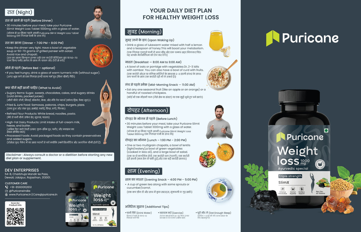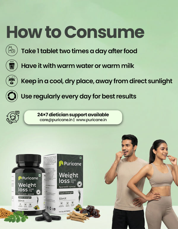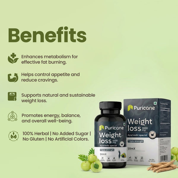 Puricane Weight Loss Tablets are a premium Ayurvedic weight loss supplement made with a balanced blend of traditional herbs that support healthy and sustainable weight management. Each tablet delivers 1000 mg of powerful herbal formulation, developed according to authentic Ayurvedic principles to support daily wellness and dietary balance.
